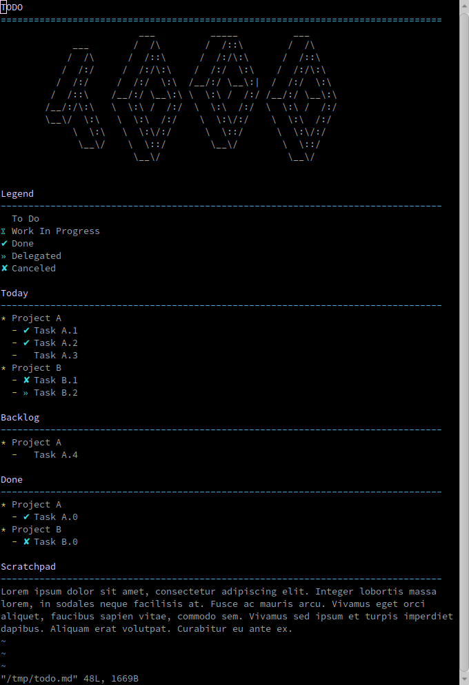 W pracy jednak unikam tego rodzaju programów, by minimalizować shadow IT (skala problemu i tak jest duża). W szczególności nie wykorzystuję narzędzi chmurowych, przez które mogłyby wyciec newralgiczne dane, a niewątpliwie do takich zaliczałaby się aplikacja do planowania zadań. Pomyślałem, że najprostszą alternatywą byłby zwykły plik tekstowy w formacie Markdown, którym zarządzałbym w Vimie. Oczywiście, Vim ma pluginy do list zadań, ale stwierdziłem, że prosty plik w zupełności mi wystarczy, gdyż od bardziej skomplikowanych funkcji, jak określanie zależności między zadaniami czy przypomnienia, mam w pracy inne narzędzia, np. bugtracker i firmowy kalendarz. Ja potrzebowałem tylko zapisać kilka bieżących zadań, czasem dopisać do tego jakieś notatki.